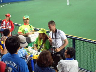 外野席のフェンス上には所々盛り塩がしてあり、そろそろ何とかしたい、何とかして欲しいという気持ちが表れている。でも試合終了後は、みんなさばさばしている感じ。敗戦に怒る人など皆無に近い。投げ込まれたメガホンは1個だけ。売り子と記念写真を撮ったり、YMCAを踊ったりする外国人グループがいて、飽きずに楽しめました。