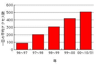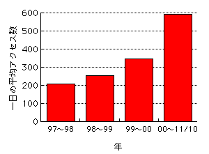 アクセス数が増えていった理由には、インターネット人口の増加が考えられます。市場が大きくなれば(人が増えれば)アクセス数も当然伸びる。当たり前ですね。それから多くの人に見てもらう(アクセス数を増やす)ことをテーマの1つに掲げて実践しているHPなのですから、増えない方がおかしいのです。世間には「アクセス向上」を謳いながら、アクセス数の少ないHPがたくさんありますが(^_^;)。