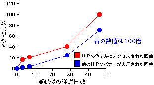 この結果をもう少し詳しく見てみましょう。赤の折れ線グラフから、バナー設置初期は急激なアクセス数の伸びを見せていることがわかります。しかしその後はバナーの表示回数を示した青の折れ線グラフと同じ傾きで伸びています。従ってバナー経由のアクセス数は、開設初期を除いてバナーの表示回数に比例するということになります(当然と言えば当然ですが)。また、30日経過後に急に傾きが大きくなっていますが、これはCSJのシステムの変更でバナーの表示速度が速くなったため実質的なバナー表示回数が増えたことと、新規受け付けを再開しバナーが表示されるホームページの数が増えたためと思われます。この傾きに関しては、さらに期間を伸ばしてどの様に変化するかを追っていきます。