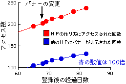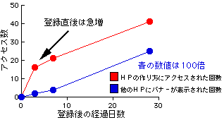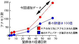 ところでこの65日目ですが、この時点で「他のホームページに私のバナーが掲載された回数」がちょうど1万回となりました。十分にデータも取ったことですし、また一本調子でアクセス数が増えていることから、ここらで一発アクセス数増加のテコ入れ策をうってみることにしました。そのテコ入れ策とは、「バナーのデザインを変更する」ことです。「こんなことで増えるのか」と思われるかもしれませんが、その根拠については下のグラフをご覧下さい。これはバナーエクスチェンジが開始された当初のアクセス数の増加の推移を示したものです。これを見ると急激にアクセス数が増えた後、定常的な増加に転じています。そこでバナーを変更することで「目新しさ」を加えてこの急激な増加を再現しようというのが今回のテコ入れ策です。