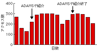 先日このHPがADAMSで紹介されました。ご覧の通り、結果は全くダメでした。原因は、まだまだ加入者数が少ないためだと考えられます。なお上のグラフ中、アクセス数が急に落ち込んでいる部分がありますが、これは休日のためです。
