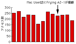 「Flying AZ-1」は'97年11月18日発売のMacUser誌、それから宝島のCD-ROM付ムック本「使える・遊べる! オンラインソフト1000」('97年11月28日発売)、Mac Life誌('97年12月18日発売)、TecWin誌('98年1月8日発売)で紹介されました。これから紹介するのは、以上3つの中で最も大きく誌面を割いて紹介されたMacUser誌のデータです。が、全く増えませんでした。最悪の手段のダブル効果ではどうにもなりません。