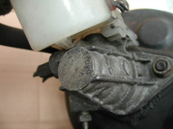 対策品みたいな形をしたものを分解すると、マスターバックの表面にブレーキフルードが垂れるということはなかったのだが、内部には多少漏れた跡がある。これはツインカム用の対策品と同じ傾向だ。