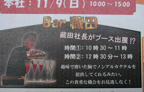 これ、チラシを拡大した物。キーレックスの倉田社長がみずからバーテンダーとなり、ノンアルコールカクテルを振る舞うというのだ。個人的に、一番注目したイベントだ。