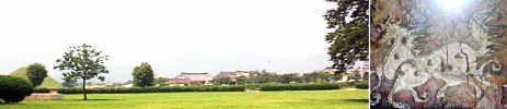 釜山の喧騒と打って変わって穏やかな田園風景が広がる古都・慶州である。最初の観光は古墳公園「大陵苑」。広大な敷地にお椀型の古墳が数多く保存されている。その最も奥に「天馬塚」がある。ここから発掘された馬具のひとつに鮮やかな天馬の絵が施されていたところからの命名。思わずデジカメのシャッターを切ってしまった。 |