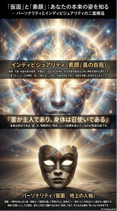 パーソナリティ(人格): 地上で肉体というマスク(仮面)を被っている時の限定的な自己です。これは肉体の死とともに消滅する、一時的な「側面」にすぎません。