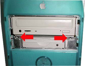 2.写真右の赤や印の部分のネジを外します。これでドライブベイごとドライブが取りだせます。 |