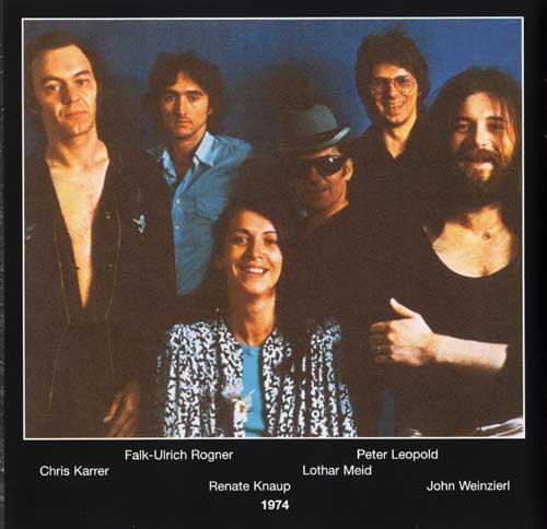 1974 | Einsjäger & Siebenjäger/Popol Vuh原画は不詳だが義経の屋島の合戦絵が曼荼羅模様に埋め込まれた、なんとも西洋的な東洋趣味、更に『Salmi di Re Salomone(ソロモン王の詩編)』から採られた歌詞等、要するに当時の“西欧でないもの”を無造作にまとめたエスニック趣味が苦笑を誘う五作目。路線的には『Hosiana Mantra』の発展型。フィッシェルシャー(Daniel Fichelscher)の存在感が大きいエスニックの入った耽美民族路線。リズム入りであるところから、そのなかでもコンパクトで聴き易いものだろう。音楽的には特にフィッシェルシャーの曲に顕著だが、ドラムとナチュラルなギター、美しくもシンプルなメロディはアモン・デュール2を髣髴とさせるものがある。おもしろいところでは、AD2のプロデューサだったキュプラー(Olaf Kübler)がフルートでクレジットされている。 |