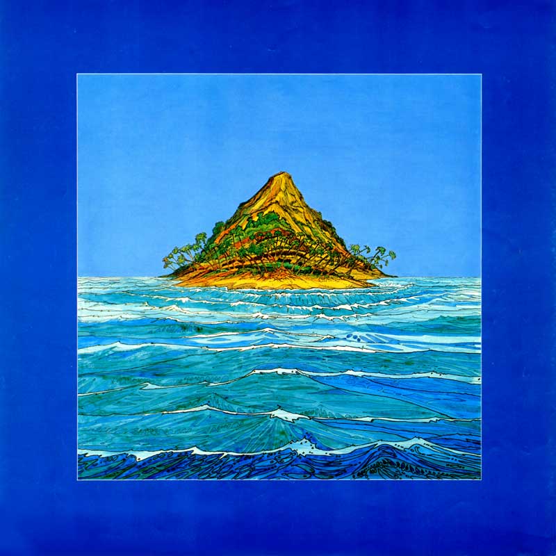 1974 | The world became the world/Premiata Forneria Marconiいろいろな意味でP.F.M.が世に名を知られるきっかけとなった英語盤。ちなみにこの英語盤のイタリア語バージョン(同じジャケデザインで緑のもの)もあります。タイトル曲の「甦る世界」はもともとイタリア盤では「9月の印象」というタイトルで、とてもしっとりした質感のある佳曲。カラカラに乾燥した夏が終わって、9月のすがすがしい大気の中で、雨に洗われてしっとりと濡れた緑が美しい、といった情景を歌っています。美しいだけで一曲できちゃうなんて短歌や俳句や五言絶句の世界だ。 ジャケットはいわゆる変形ジャケットで、中央の島の部分が繰り抜きになっていて、最初は島の平面図(取り外して山形の立体細工にする)がついている。それを外すと繰り抜き部分から内スリーブが見えるという仕掛け。内スリーブの裏はこの写真なのだが説明がなくて意味不明。 |
