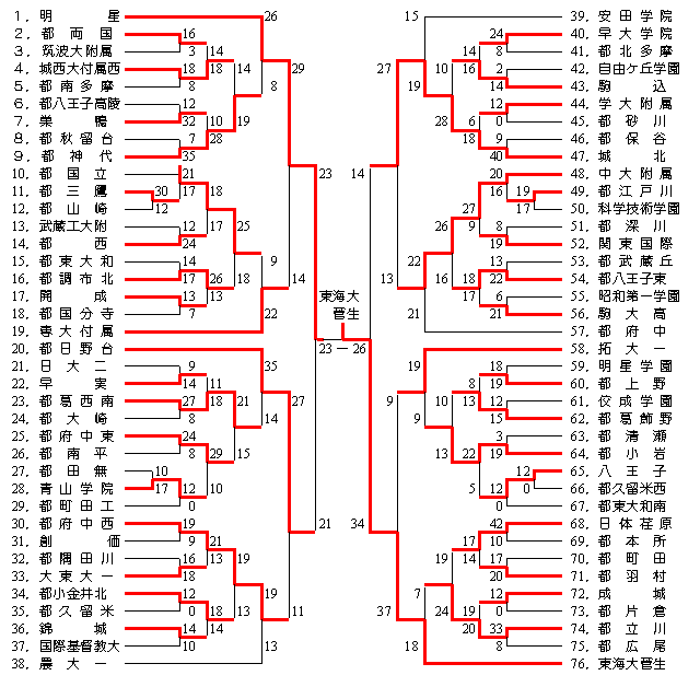 代表決定戦 府中西 30−25 専大附属 拓大一 26−25 中大附属 府中西 34−22 拓大一 3位決定戦 日野台 23−17 城北