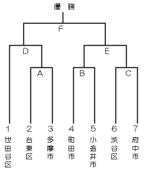 *5月6日(月)、男・女の同一市区町村が同一時間帯となったため、試合順番を上記のように変更いたします。 5月6日(月) 屋内球技場 駒沢体育館 5月19日(日) 5月26日(日) 1 10:00- 男子1回戦 い 新宿区−町田市 女子1回戦 A 台東区−多摩市 屋内球技場 屋内球技場 2 11:00- 男子1回戦 う 府中市−渋谷区 女子1回戦 B 町田市−小金井市 1 10:00- 男子2回戦 く 1 10:00- 男子準決勝 し 3 12:00- 男子1回戦 あ 台東区−多摩市 女子1回戦 C 渋谷区−府中市 2 11:00- 男子2回戦 け 2 11:10- 男子準決勝 す 4 13:00- 男子1回戦 え 調布市−練馬区 女子準決勝 D 世田谷区−A勝者 3 12:00- 男子2回戦 こ 3 12:20- 女子決勝 F 5 14:00- 男子1回戦 お 江戸川区−墨田区 男子1回戦 き 大田区−中央区 4 13:00- 男子2回戦 さ 4 13:30- 男子決勝戦 せ 6 15:00- 男子1回戦 か 世田谷区−江東区 女子準決勝 E B勝者−C勝者 ****** 試合開始時間を間違えて