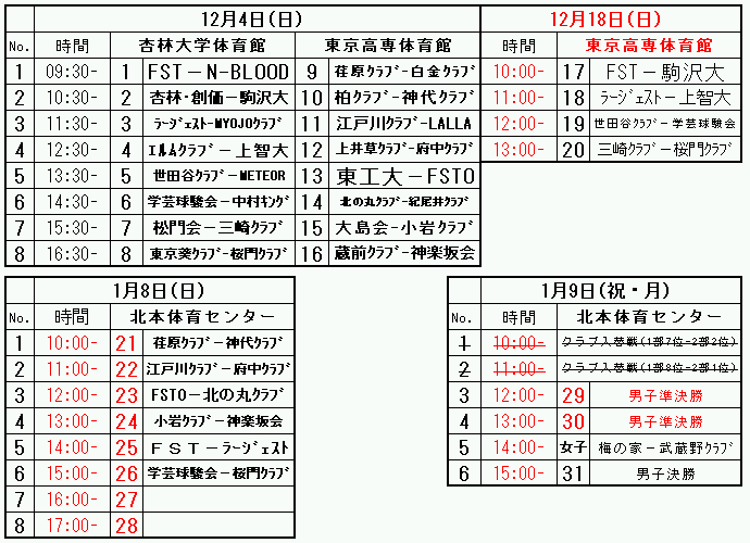 ※ 連 絡 12月18日(日)第1試合 FST−駒沢大 は、駒澤大が棄権する旨連絡があり、FSTの不戦勝とする。