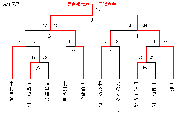 3試合目 12:20- 男子2回戦 東京教員 1 ( 0-18, 1-15) 33 三陽商会