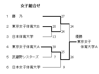 東京女子体育大学A 39 (20- 4, 19- 3) 7 武蔵野シスターズ