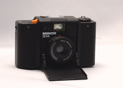 これは知る人ぞ知る、リコーFF1はマネだとも言われた、ドイツのユニークなメーカー(本来はラトビアにあった、スパイカメラのメーカー)の、35mmフルサイズながら小さなフォールディングタイプで、その意味外観も機能も使い勝手もFF1とほとんど同じです。ミノックスは長年にわたり、いくつかのバリエーションモデルを発売をしてきたようですが、このMLはシャッターが絞り優先式(FF1はEEプログラムのみ)で、前ぶたを開くのはボタンを使うところ(FF1は前ぶたの縁をつまんで引っ張り出す)、前ぶたを閉じるとファインダー窓も覆ってしまうことなど微妙に違い、またフィルムの装填には裏ぶたがヒンジで開く一般的な方式ではなく、裏ぶた部分が底と一体で抜ける、欧州製にありがちなちょっと変わった方式でした。
