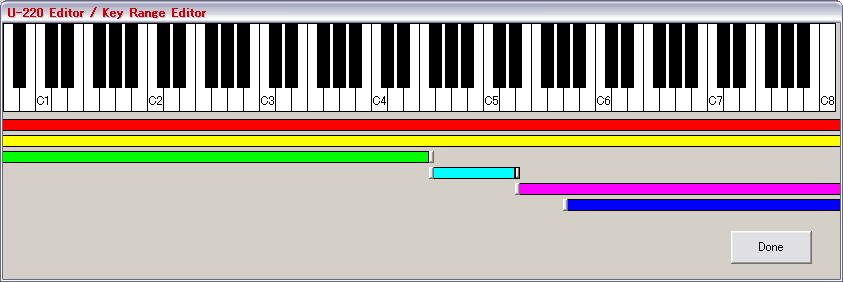 「パッチ編集画面」で「Show Key Range Editor」ボタンを押すと以下の画面が現れます。鍵盤楽器などで異なるパートにそれぞれ異なるキーレンジを設定したい場合に便利です。