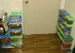 また飼育環境は以下の通りである。 我が家は9階建マンションの6階角部屋で、南向きの3LDK?(どう見ても3DK)である。飼育場所は南側ベランダと一番暖かい部屋(真冬でも常時15度はあると思う)で、この部屋は窓が無く、冬はリビング?(ストーブ設置)と通しにしてあります。 |