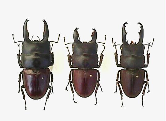 一番右は中華人民共和国四川省産だが、見たことがある標本はこの個体だけである。大腮の内歯は先端に有りヨツバヒラタクワガタに似たカタチをしていて、上翅は真っ黒で艶がない。中国産のティティウスヒラタは近年になり何ヶ所からか入って来ている様だが、まだ多くは見た事がなくサイズも良く知らない。産地によって差があるとも言われており興味が持たれる。