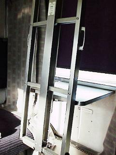 というわけで、こちらが上段。 結構高いのね。 ……「あさかぜ」よりも、B寝台でも個室な「サンライズ」の方が人気が高いので、結構席はガラガラだったのだ(^-^;)。お蔭様で、1ブロック(4席)を@が独り占めすることが出来ました( ̄ー ̄)。まるで四人用の個室を1人で使っているような広さで、快適快適♪(仕切りがカーテンだけでそこがややスカなんだけどね(^-^;)) |
