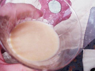 Fig1: 「プリンの口当たりがそのままに」といううたい文句に偽り無し( ̄ー ̄;)。5回では、舌触りがまだ固形物としての名残を色濃く残しているという状態です。注ぎ入れると、固形部分が断続的にボトボトと音を立てて流入していきます。あまり美しい光景ではナイです(-_-;)。 |