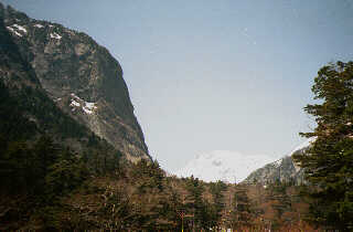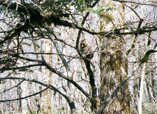 A lonely monkey watches us. Is he hungry ? Look up to the black face, Curtain Rock (Byo-Bu Iwa). Next