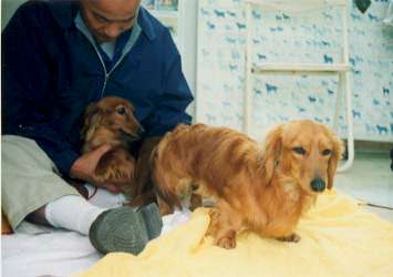 | 午後から交配のためにブリーダさんのところに行ってきた。 ブリーダさんの家に着くと早速、ブリーダさんがキャンディーの陰部を見てくれた。 ちょうどよいタイミングということ。(今日が11日目) そしていよいよ交配開始。 庭にある4畳半くらいのプレハブの中にブリーダさん夫婦がキャンディーと婿殿を連れて入っていった。 交配の様子を見たかったのだが、「キャンディーが助けを求めるので交配がうまくいくまでは外で待っていてください。」 と言われキャンママと二人で外で待機。 しばらくすると部屋の中からキャンディーの「キャン、キャン、キャン、キャイ〜ン」という悲鳴。 その後、部屋の戸が開いて「いいよ、中に入って。」と言われ、 部屋を覗くとブリーダさんがキャンディーの上に乗る婿殿のお尻を押さえていた。 初めてだったためか、入り口が狭くてかかりが浅いということだった。しばらくその状態だったのだが、 3分くらいすると奥まで入ったようでブリーダさんが婿殿のお尻を押さえるのをやめた。 その後、キャンディーと婿殿のお尻同士がくっついた状態になった。 その後もブリーダさんはキャンディーが動かないようにしっかり抱きしめていた。 その間も、キャンディーは時々「キャン、キャン、キャン!」でも婿殿は目をつぶって気持ちよさそうな顔をしていた。 20分ほどたってやっと婿殿が離れた。 という具合で1回目の交配は無事終了。 ほんと、痛そうで可愛そうだった。自宅に帰ってきてからのキャンディーはとってもおとなしくなっている。 あさってに2回目の交配をする予定。 |