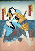 | この2枚は不思議な組み合わせである。 続き物でありながら、左は国貞舎豊国の名、 右は一陽斎豊国の名で摺られている。しかも 色が合わない。同じ版を時期を違えて摺った ものか。 |