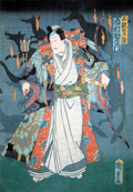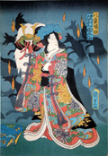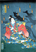 | 武田勝頼の許嫁八重垣姫は、勝頼が将軍足利義春の暗殺を企てた容疑で切腹させたられたと聞き、その死を悲しんで、勝頼の絵に香を焚いて供養していた。しかし、腹切したのは替え玉で、勝頼は名を蓑作と改め、八重垣姫の前に現れる。 簑作が、諏訪法性の兜を盗み出すようもちかけたことから、それが勝頼と知った八重垣姫は、父の長尾謙信が追っ手を差し向けたことを勝頼に知らせようと、諏訪明神の使いの狐の霊力に助けられつつ、勝頼の後を追う。 国貞の絵は、背景にぼかしを入れた狐の影絵を配し、狐火まで散らして、その技術力を誇示するかのような凝った作りになっている。 |