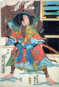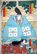 | 中老尾上に仕えるお初は、局の岩藤に草履で打たれた主人の恨みを晴らし、お家の大事を救うスーパーヒロインである。利発で武道にも優れたお初のきびきびとした感じがよく表現されている。背景には若い頃の凝った作りは見られないが、単純化された構図の中に、役者の魅力とお初の本質を明快に描いている。豊国晩年の傑作であろう。 |
