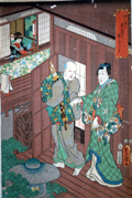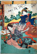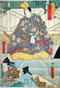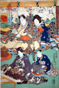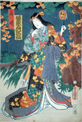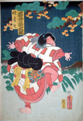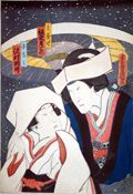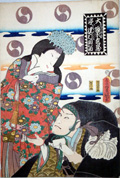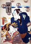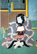 | ・歌川国貞(三代豊国) 天明6(1786)年〜元治元(1864)年 初代歌川豊国の高弟。文化6年(1809)頃から錦絵を描き始め、「偐紫田舎源氏」など草双紙の挿絵、役者絵、美人画によって、国芳・広重と並ぶ幕末の代表的な浮世絵師となった。 師の没後の天保15年、二世豊国を名乗ったが、二代目は別にいたので三代目と呼ばれることが多い。豊国となってからは乱作の傾向もあるが逸品もある。 主な門人に、二代国貞、国周らがいる。 |