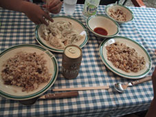 出発の朝炊いたご飯をタッパーに入れクーラーボックスにて持参。他にチャーシュー、卵、玉ねぎのシンプルチャーハン。調理時間10分。