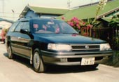 スキーにハマっていた頃に、どうしても4WDじゃなきゃってことで、次に選んだのはスバルレガシーです。水平対向エンジンの独特のババババって音はかなり気に入ってました。屋根の2本のレールがスキーキャリアーを付けるのにとても便利でした。この車には、面白いドアロックシステムがついていて、暗証番号の数だけドアノブ?をカチャカチャやると、ロックが解除されるという、キーの閉じ込め対策が付いていました。これは、とても重宝しました。 |