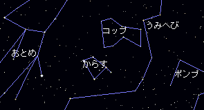 アポローンは黒焦げになったカラスが喉が乾いてもコップ座の水を飲めないように、 星のくぎで天井にはりつけにして、動けなくしてしまったと言う事です。