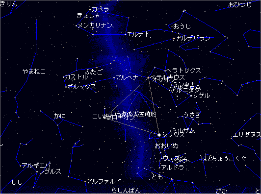 オリオンのベルトの位置にある三ツ星が結構目立ちます。そのベルトを伸ばしていくと その先におおいぬ座のシリウスがあります。次に残りの星で一番明るいのがこいぬ座のプロキオン。 このように探すのが一番簡単でしょう。