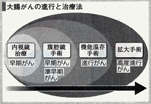 1998年の厚生省統計でがんによる死者をみると、大腸がんは第3位。肺がん、胃がんに次いで多い。食生活の欧米化から今後の増加も予想され、治療法の進歩が期待されている。病巣を大きく切り取る手法が減り、従来は取っていた自律神経を残す機能温存手術が広がった。この方法だと、排尿や性機能を保つことができる。さらに最近入院を短縮し、傷跡を小さくする為、腹腔鏡手術が増えてきた。