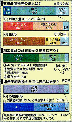 発行されたはかりの「グリーンコンシューマーになる買い物ガイド」(小学館)には、全国80チェーンのスーパー、生協、コンビニの商品・環境対策などを評価した「格付け」がある。調査項目には「有機農産物の信頼性対策が優秀」 「無添加食パンがあるか」といった食べ物の安全確保に関する項目も多い。「あらっ、ハムは全部、食品添加物入り」「この野菜、本当に『有機』かしら」 はじめて調査に参加した主婦・大西優子さん(60)は咋年夏、千葉県棺市の大手スーパーの店舗内を調査対象の商品を探すため約1時間、行っかり来たりした。各地の消費者のこんな努力がまとまったのだ。企画したグリーンコンシューマー全国ネットワークの世話人たちは、その思いを本に書き込んだ。