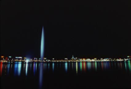 86年6月にスイスのジュネーブに行ったときに、レマン湖にせり出した桟橋(パキ防波堤)から20秒くらいの長時間露光で撮ったものです。光の柱に見えるのは、高さ145mの巨大な噴水です。中央右寄りに見える一番高い建物が、サン・ピエール寺院です。この寺院はカルヴァンが1536年から1564年までの間、説教をしたという、宗教改革ゆかりの寺院で、カルヴァンが使った椅子も残されています。その関係もあって、宗教改革記念碑という大きな記念碑がバスチョン公園に立っています。ジュネーブには、ルソーの生家もあるほか、世界労働機構(ILO)、世界保健機構(WHO)、赤十字国際委員会、国連ヨーロッパ本部(パレ・デ・ナシオン、戦前は国際連盟の本部だった)など多数の国際機関が集中しています。(2000年6月11日)
