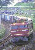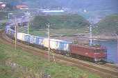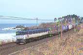 日本海沿いを行く貨物列車、朝日に車体が輝く。 田端運転所で唯一の前面窓ヒサシ付!133号機。 北斗星仕業のEF81は、とにかく「速い!」です。 |