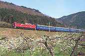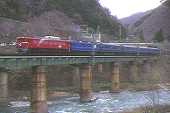 上越線の名所、大正橋を行く迂回北斗星4号。 水上の鉄橋を行く上越線 迂回北斗星2号。 関東からは姿を消したローズピンク塗装のEF81。 |