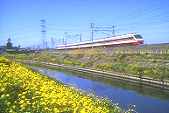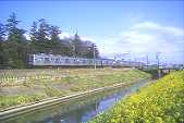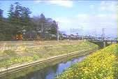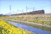 | 左 菜の花が咲く川沿いを行く重連貨物K606列車。 中 こちらは下りのK605列車、午後が順光です。 右 同じ場所で撮影した10000系の6両編成です。 |