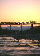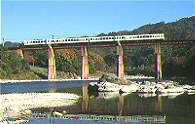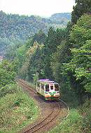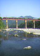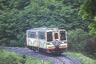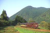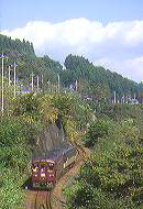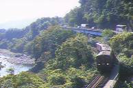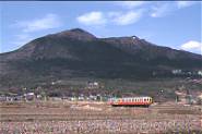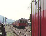渡良瀬川沿いに足尾、間藤を目差す各停。 曲がりくねった線路を走りレールバスが来た。 荒神山を背に終点桐生を目差す。 |