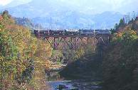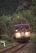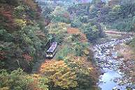 美しく紅葉した渡良瀬渓谷を行く、わ89型。 渡良瀬の車両はそれぞれ愛称付きです。 3両全部が違う色で編成されたレールバス。 |