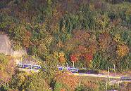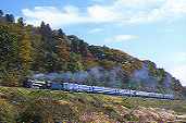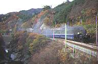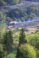 電化区間で上から狙うと架線の処理が難しいです。 紅葉は綺麗ですが、下り坂なので煙が出ないです。 |