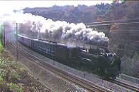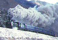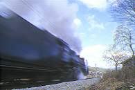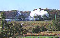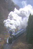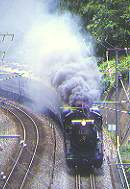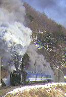 煙を吐き突っ走るD51をスローシャッタ−で撮影。 善知鳥峠の25パーミル勾配を行く、善知鳥峠号。 初の信越線走行で、多くのファンが集まりました。 |