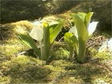 湿地帯を好む水芭蕉はコケの合間から可 憐な花を咲かせている |