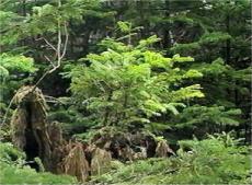 | この森にも異変が起きつつある。倒木が 腐って肥料になり、土地が肥えたので、 トドマツが進入してきた(写真はトドマツ林) |
