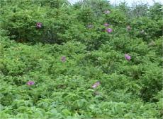 | ハマナスには強烈な棘があるので、キタキ ツネなどの動物は潜り込めない |
