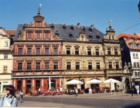 | バンベルクは街全体が世界遺産に指定されており、7つの丘の上には大聖堂,教会、修道院が建ち、水郷の美しい景観から小ヴェネッィアとも呼ばれている古都で第二次世界大戦の被害が少なく石造りのバロック様式の建物が立ち並び中世の面影を色濃く残している。 大聖堂東内陣には中世美術の傑作「バンベルクの騎士」像があり、ド−ムは11世紀から13世紀の建築である。新宮殿のバラ園はその時期には早かった。ゴシック様式の回廊の旧司教館もすばらしい。最高の見学場所はリグニッツ川の中州に杭を打ち込んで建てられた旧市庁舎でフレスコ画で飾られた北側ファサ−ドと木組みの南側の部分が対照的である。その夜はバンベルク名物の燻製ビ−ルのラオホビ−ルを飲み、レジデンスシュロスホテルに宿泊する。 5月3日ゲ−テ街道に位置するエアフルト、ヴァイマルの見学。 エアフルトはチュ−リンゲン州の州都で、かっては地中海とバルト海を結ぶ交通の要衝として栄え、ハンザ同盟の一員として発展してきた。染料タイセイ(大青)は街と市民に富と権力をもたらした。その当時の面影を残す街並みが保存されている。 旧市街のはずれの広いド−ム広場には大聖堂とセヴェリン教会が立ち並んでいる。教会の前には物乞いの人が座っている。東西ドイツの格差か。教会とド−ムの間には大階段があり、夏にはこの階段を使用して音楽会などが催される。15〜16世紀建築のギルドハウスやネオ・ルネッサンス様式の市庁舎の立ち並ぶフィッシュ・マルクト。ゲラ川にかかるクレ−マ−橋は一見の価値あり。橋の両側には狭い道を挟んで三十二軒の店がひしめき連なっている。絵になる風景である。 |