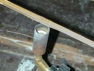V 曲がりの矯正 @ご存知のように竹を曲げる(この場合は曲がったものを真っ直ぐにする、ですが)には竹を熱する必要があります。そのための熱源 としてはアルコールランプ(小・中学校時の理科実験でよく使いました)、ヒートガン(ヘアードライヤーの強力なヤツ)が多く使 われています。この炎・熱風を曲げたい箇所に当て加熱します。 個人的にはその両者ともあまり好きにはなれません・・・・アルコールランプはなんとなく火災に対する不安が付き纏います。 周りは燃えるものばかりですからね。万が一ランプをひっくり返しでもしたら、というのが使用しないわけです。ヒートガンは熱量 も十分、取り扱いも楽なのですがなんと言ってもその運転音。じっくり作業したいのに気になってしょうがありません。そこでガス バーナーの使用となります。ただし要求されるのは高温炎より極弱火での安定性ですので炎の微調整できるものに限ります。家庭用 カセットガスボンベが使えるタイプはエコノミーでもありお勧めです。