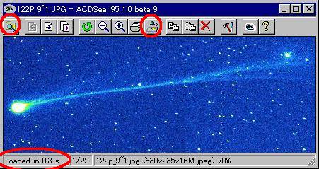 写真(左)の画面の左下に"Loaded in 0.3 s"と出ているように、何秒でこのソフトが表示できたかチェックできるようになっています。JPEGでは今まで使っていた「GV」に較べて数分の1にスピードアップでき、大きなソフトでも数秒しかかからず、遅いCPUの方がより効果的です。